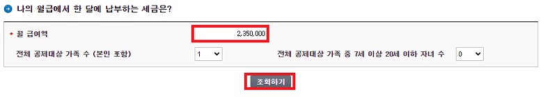 월 급여액을 입력하시고, 전체 공제대상 가족수, 7세이상 20세 이하 자녀수를 넣고 조회하시면 갑근세 계산이 가능합니다.