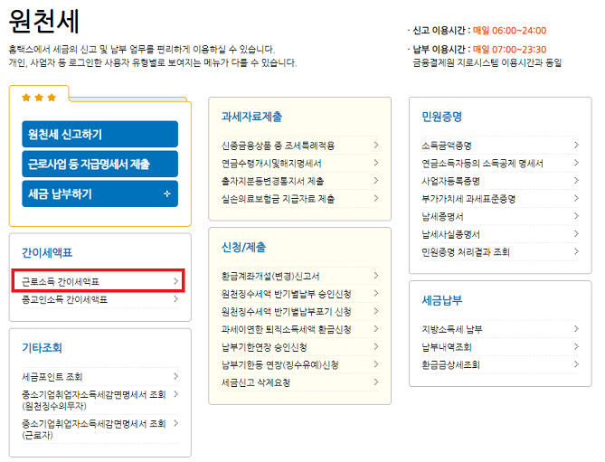 원천세 메뉴에서 "간이세액표"라는 항목의 "근로소득 간이세액표"를 선택합니다.