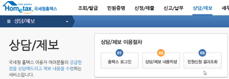 홈택스 상담 페이지로 이동후에는 상담과 제보에 대한 안내를 하고 있습니다. 상담하시려면 홈택스 로그인 후에 상담 및 제보 내용을 작성하고 추후 민원신청 결과 조회를 통해 상담 결과를 확인하실수 있습니다.
