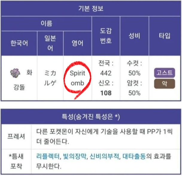 Spiritomb라도 되어 있는데 Spirit(영혼) + Tomb(무덤)을 모티브로 만들어낸 합성어다.