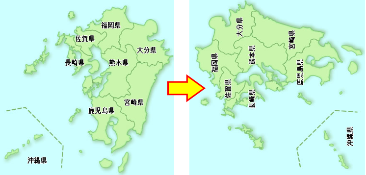 우선 일본의 규슈지방 실제 지도다. 이 지도를 오른쪽으로 90도 돌리면 포켓몬스터 오메가루비&알파사파이어 버전의 지도와 비슷하게 된다.