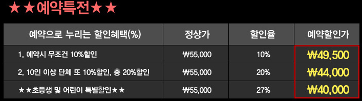 가격은 55,000원으로 저렴한 가격은 아닙니다. 하지만, 온라인 예약을 이용하시면 10% 할인이 적용이되니 꼭 온라인 예약을 하시는것을 추천드립니다. 또한, 예약 특전도 있으니 단체 및 어린이 할인도 참고하시기 바랍니다.