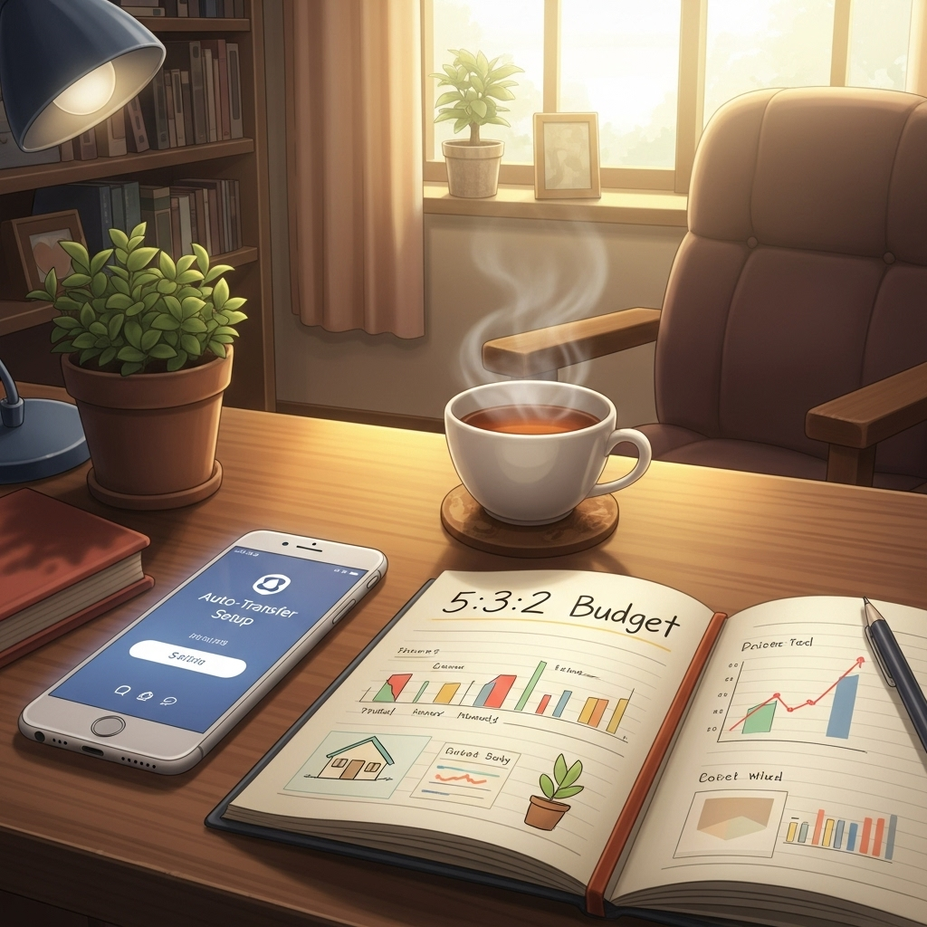 - 5:3:2 법칙: 생활비 50%, 저축·투자 30%, 자기계발·여가 20%.