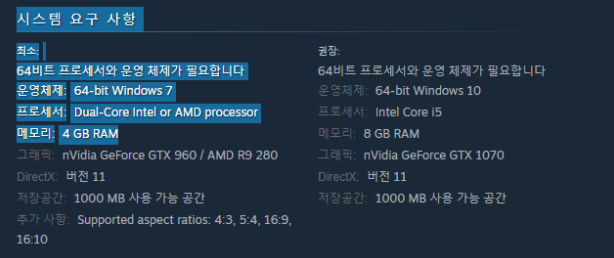 최소 사양에는 윈도우7 64비트 이상, CPU에는 Intel 듀얼코어 이상, 메모리는 4기가 이상, 그래픽카드는 GTX960 이상입니다. 요즘 PC에는 문제없는 사양이기 때문에 크게 무리 없이 플레이가 가능합니다.