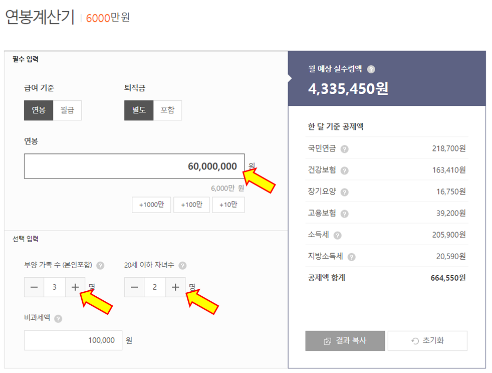 연봉계산기에서 연봉란에 본인이 원하는 연봉금액을 넣으시면 자동계산이 됩니다. 여기서 부양가족수와 20세 이하 자녀수를 더 넣게 될 경우 세금이 줄어들어 실수령액이 증가하는 것을 볼 수 있습니다.