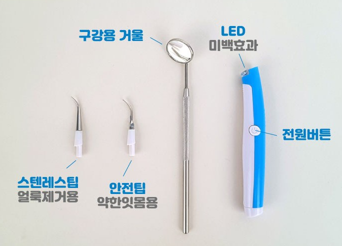 구성품은 본체가 있으며, 구강용거울, 얼룩제거용 팁, 약한잇몸용 팁 이렇게 네가지로 구성되어 있습니다.