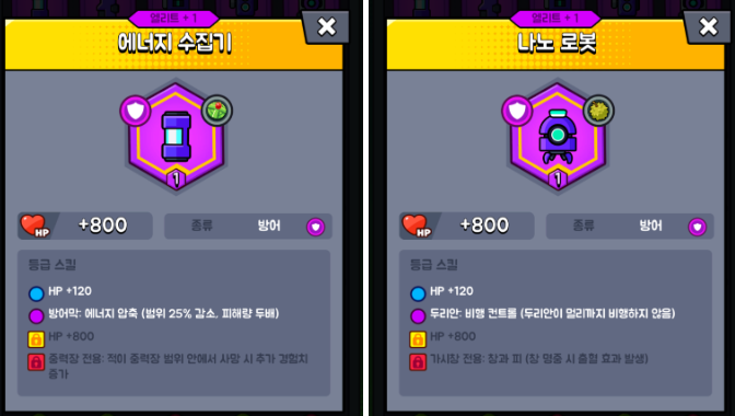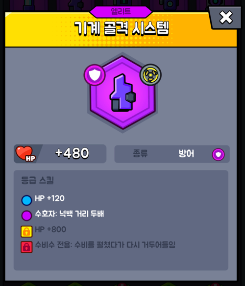 기계골격시스템은 방어용 기술 필수인 수호자의 넉백 거리를 두배로 늘려줍니다. 탕탕특공대에서 방어용 1순위 무기로 사용중인데 더 넓게 보호해주니 공격형으로도 사용하기 편해졌다고 보입니다. 방어용 부품 중 추천 1순위 입니다.