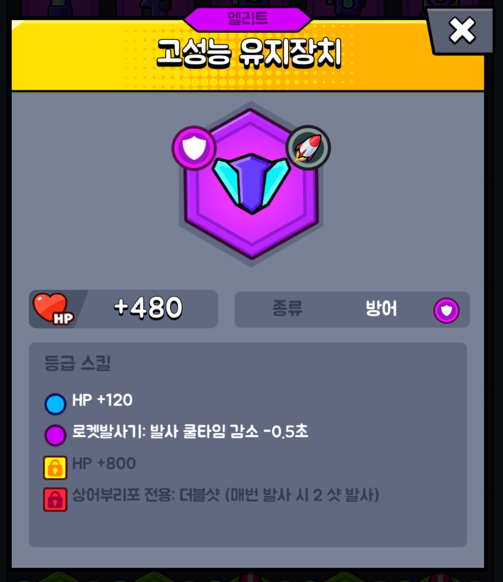고성능 유지장치는 로켓발사기 쿨타임을 -0.5초 줄여주는데 크게 체감이 적습니다. 하지만 전설 등급으로 올리면 상어부리포가 2개 발사되기 때문에 전설등급이 되면 확실한 효과를 보여줄 것으로 보입니다. 다만 전설등급까지 너무 오래 걸리기 때문에 방어용 부품 2순위로 넣었습니다.
