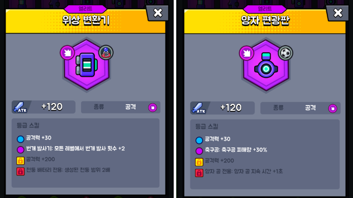 위상변환기는 번개 발사기의 번개를 2번 더 내려치게 되고, 양자편광판은 축구공 피해량이 30% 증가하게 됩니다. 나름 사용하면 몹들을 잡는데 수월하지만 눈에 보여지는 효과가 생각보다 적은 편이라 추천 3위에 넣었습니다.