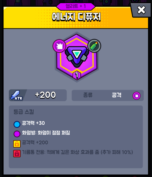 에너지디퓨저는 화염병 특수기능을 가지고 있습니다. 원래도 큰 범위를 자랑하는 화염병인데 더욱 범위를 넓혀주어 화면 전체를 불바다로 만들어 버린다고 합니다. 딜량만 받쳐준다면 유용하게 사용할것으로 보여 추천 2순위 입니다.
