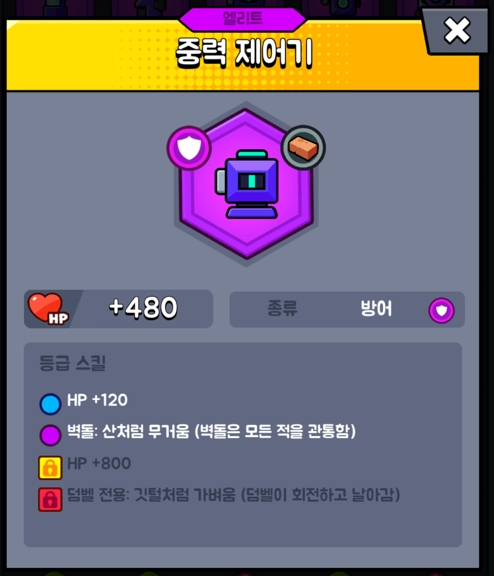 중력제어기는 벽돌의 특수기능을 부여합니다. 벽돌이 무거워져 모든 적을 관통하는데 벽돌의 돌파 단계가 되면 어차피 관통을 하기 때문에 큰 효과를 보기 어렵다고 판단하였습니다. 3순위 입니다.