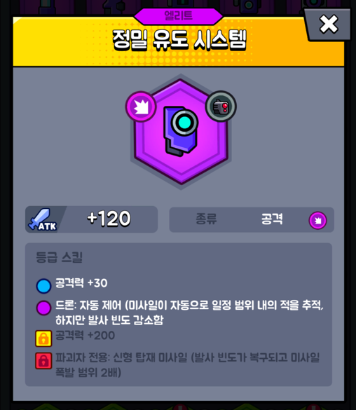정밀유도시스템은 드론의 특수능력을 부여합니다. 드론은 좌우로 원을 그리며 미사일을 발사했는데 특수능력으로 유도탄을 발사하게되어 보다 쉽게 컨트롤 할수있고 엄청난 딜량을 가지고 있기 때문에 추천 1순위 입니다.
