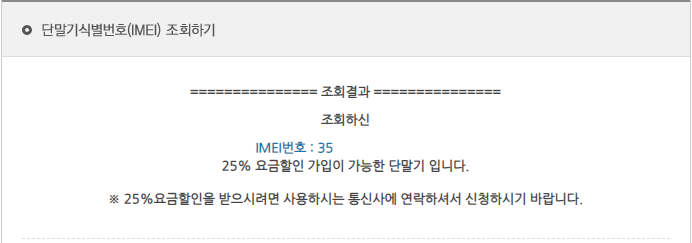 제가 조회한 결과는 25% 할인을 받을수 있는 기기로 확인되었습니다. 이러한 절차를 받는 이유는 만약 중고폰을 매입해서 사용하시는 분들 중에 잘못된 구매로 인한 분실폰으로 되어 있을수 있기 때문입니다.