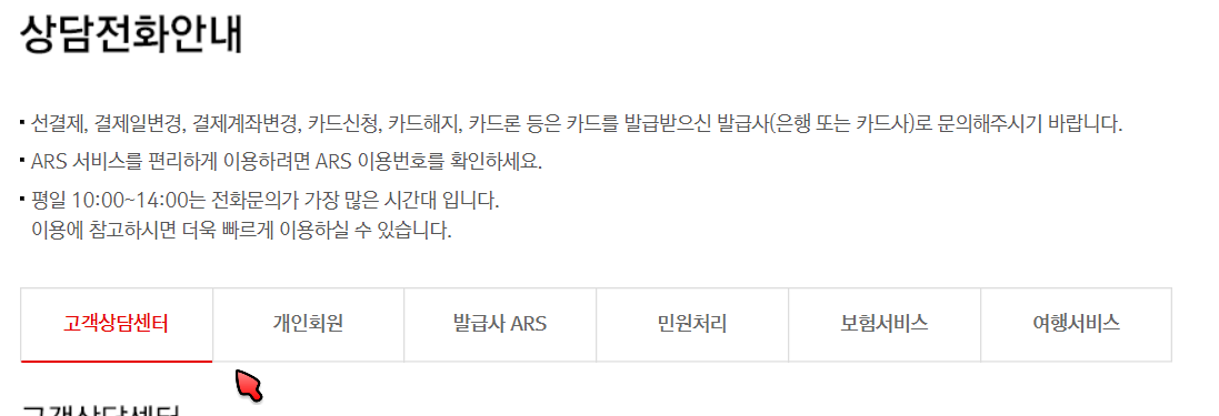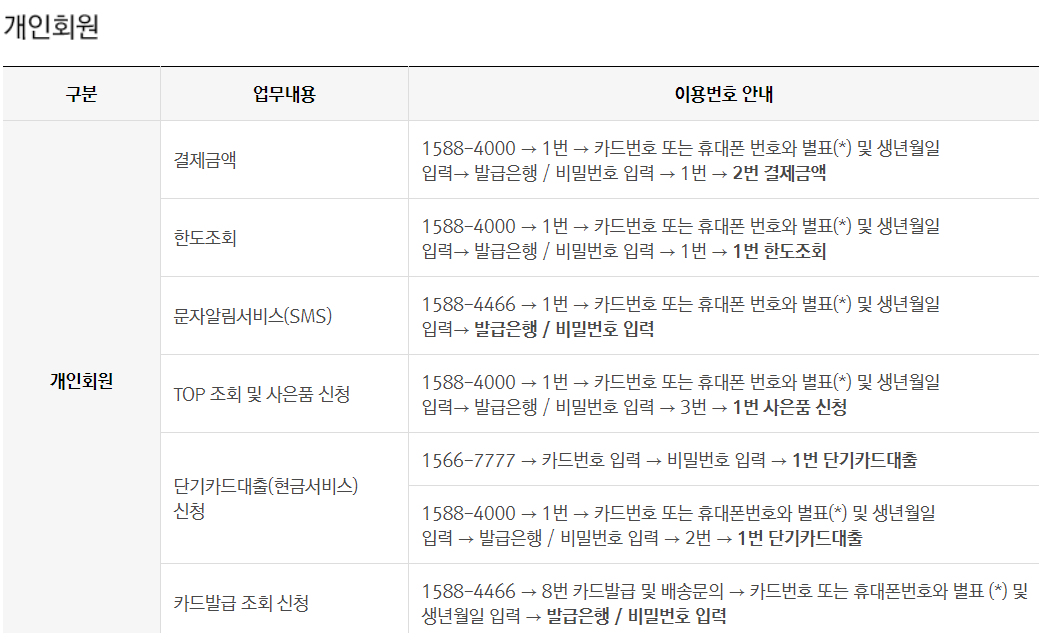 다음은 개인회원인 경우에 ARS 연결 번호에 대해서 간단하게 살펴보도록 하겠습니다. 결제 금액을 확인하려고 한다면 1588-4000 번으로 연락을 하신 다음에 1번을 누르시면 결제 금액 관련 서비스를 이용하실 수가 있고요 기타 한도 조치나 현금서비스 등도 전화로 이용하실 수가 있습니다. 다음 표에 상세하게 이용안내가 나와 있으니 참고 하셔서 ARS 서비스를 바랍니다.