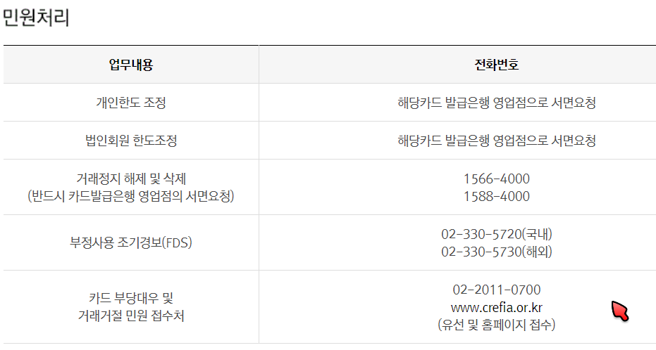 비씨카드 관련해서 민원이 있을 때 어떻게 해결 할 수 있는지 알아보도록 하겠습니다. 개인한도 조정이나 법인 회원 한도 조정의 경우에는 해당 카드 발급 은행 영업점으로 서면 요청을 통해서 처리를 하실수가 있습니다. 그리고 거래정지해제 나 삭제의 경우에는 비씨카드 고객센터 전화번호로 연결하시면 안내를 받을 수가 있습니다. 기타 부정사용이 나 카드 부당대우 등호의 기타 민원의 경우에는 각각의 해당되는 민원 연락처로 연락하시면 됩니다.