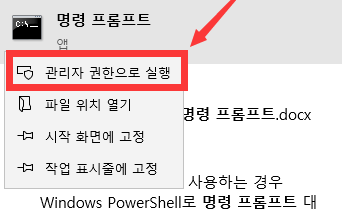 6. 명령 프롬프트를 마우스 오른쪽키를 눌러 관리자 권한으로 실행 시켜줍니다.