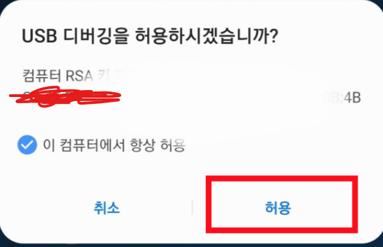 9. 그러면 갤럭시에 디버깅 허용을 하시겠습니까? 라고 팝업이 뜨는데 허용을 눌러주세요.