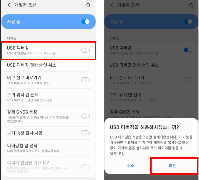 2. USB 디버깅 모드를 활성해줍니다.