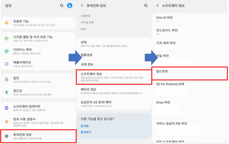설정 > 휴대전화 정보 > 소프트웨어 정보 > 빌드부분을 연타하면 "개발자모드"가 활성화 됩니다.
