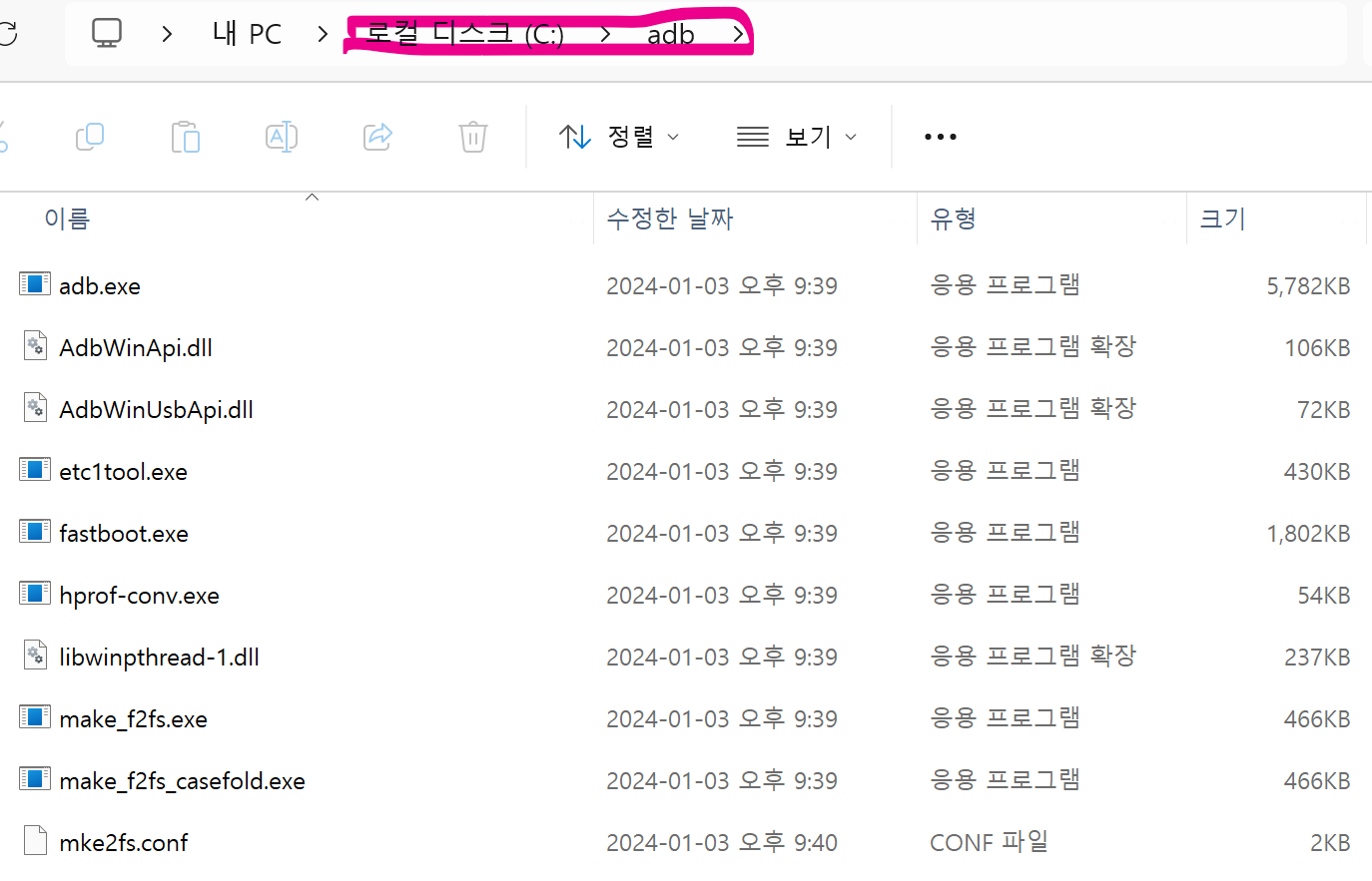 5. 다운로드 받은 파일을 압축풀고 파일들 C:\adb 폴더를 만들어서 넣어줍니다.
