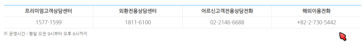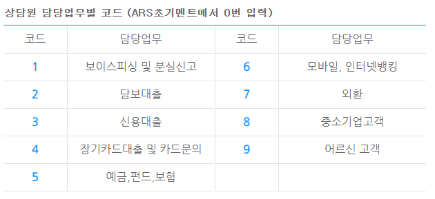 그럼 전화 상담을 이용할때 ARS 번호를 알아보도록 하겠습니다. 보이스피싱이나 분실신고의 경우에는 1번을 이용하시면 되구요 담보대출은 2번을 이용하시면 됩니다. 그리고 신용대출은 3번 서비스를 이용하시면 되구요 장기 대출이나 카드문의 관련된 것은 4번을 이용하시면 됩니다. 그리고 예금이나 펀드 보험 관련된 문의는 5번을 이용하시면 되구요 모바일이나 인터넷 뱅킹은 6번을 이용하시면 됩니다. 외환 관련된 업무 문의는 7 번을 이용하시면 되구요 중소기업 고객은 8 번을 이용하시면 됩니다. 어르신 고객은 9 번을 이용하시면 됩니다.