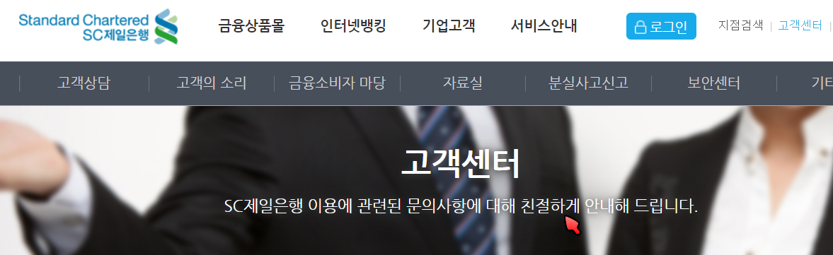 SC제일은행 홈페이지로 접속하시면 상단 우측에 고객센터 항목이 있습니다. 이 항목을 클릭하시면 SC 제일은행 고객센터 상세안내 페이지로 이동합니다.