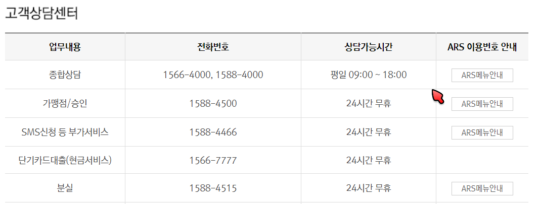다음은 개인회원인 경우에 ARS 연결 번호에 대해서 간단하게 살펴보도록 하겠습니다. 결제 금액을 확인하려고 한다면 1588-4000 번으로 연락을 하신 다음에 1번을 누르시면 결제 금액 관련 서비스를 이용하실 수가 있고요 기타 한도 조치나 현금서비스 등도 전화로 이용하실 수가 있습니다. 다음 표에 상세하게 이용안내가 나와 있으니 참고 하셔서 ARS 서비스를 바랍니다.